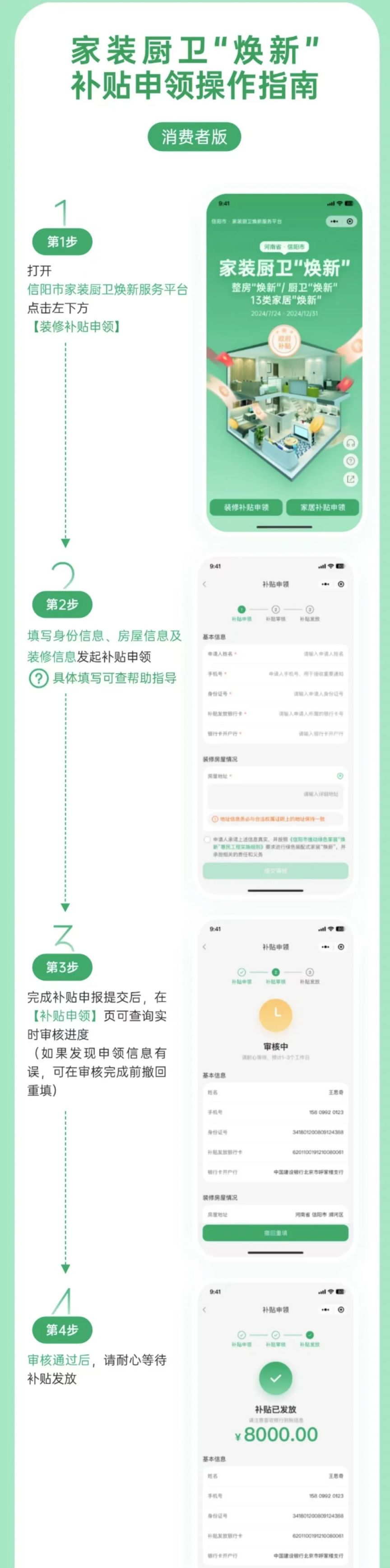 装修竣工后,个人消费者通过信阳市家装厨卫“焕新”服务平台,进入装修补贴申领页面,按要求上传装修改造合同发票等相关材料和《信阳市家装厨卫“焕新”物品物料补贴申请表》,进行申领补贴。