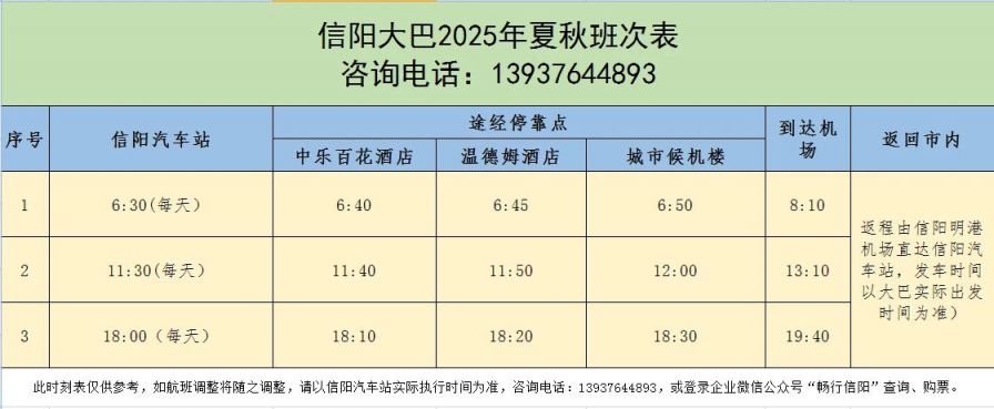 "信阳机场大巴时刻表(仅供参考,具体时间以机场公告为准):"